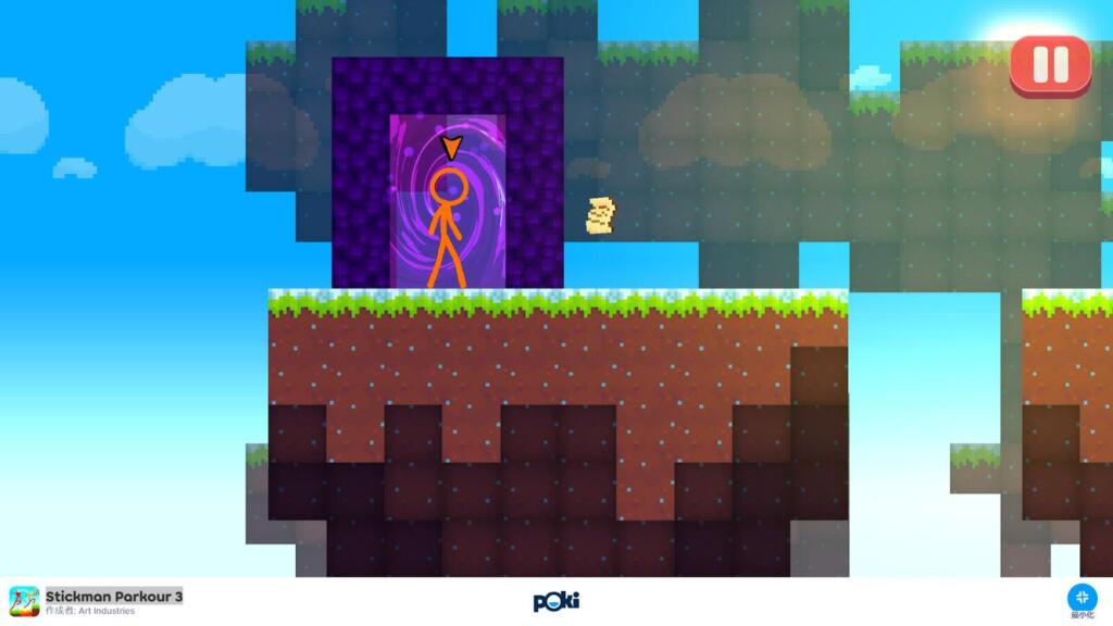 「Stickman Parkour 3」에서는 스테이지에서 떨어지면 게임 오버가 되므로 주의해야 합니다. 다음 스테이지로 나아가기 위해서는 한 번도 떨어지지 않고 보라색 게이트에 도착해야 합니다.